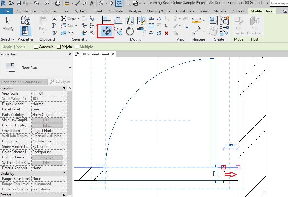 After placing the door, if you would like to move it to another wall, use ‘pick new host’ tool to move the door.